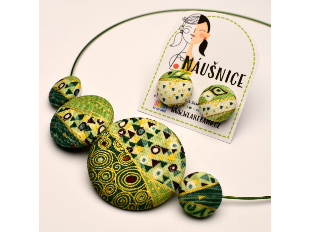 Různé druhy náhrdelníků a náušnic z buttonků.